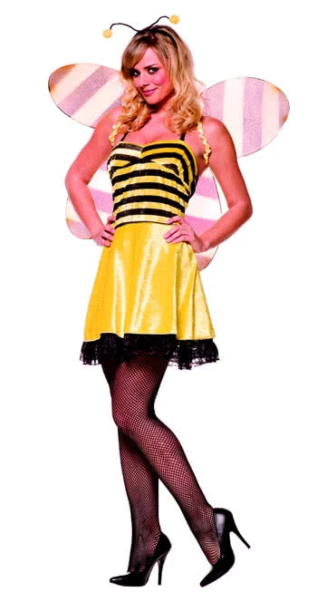 Das verführerische Kostüm der frechen Honigbiene besteht aus einem Minikleid mit Spaghetti-Trägern, das als Rockfarbe ein leuchtendes, schimmerndes gelb aufweist und zum Brustbereich in eine schwarz /gelb gemustertes Top im Streifenmotiv wechselt. Der Rocksaum ist mit verführerisch, zarter, schwarzer Spitze eingesäumt. Daserotische Bienen-Outfit wird durch zarte, große Bienenflügel komplettiert, während die Frisur durch einen Haarreif mit Bienen-Fühlern unterstrichen wird. Das freche Bienenoutfit ist der Hit für Karneval, Fasching und alle frivolen Kostümpartys! Honig und Willi nicht inkl!