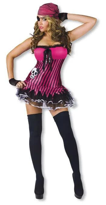 Das Rocking Skull Kostüm ML besteht aus dem sexy schwarz pinken Piratenminikleid mit Tüll Unterkleid, den Netzhandstulpen, den Strümpfen sowie dem pinken Netzbandana und ist mit einer Schleife und Rüschen verziert. Auf dem grell gestreiften Stoff ist ein aufgenähter weißer Totenkopf. Zu diesem sexy Skull Piratinkostüm passt super eine Piraten Augenklappe mit Ohrring sowie die Goldene Piraten Pistole mit Effekt und ein Piratensäbel als Piratenschwert lang 70cm .