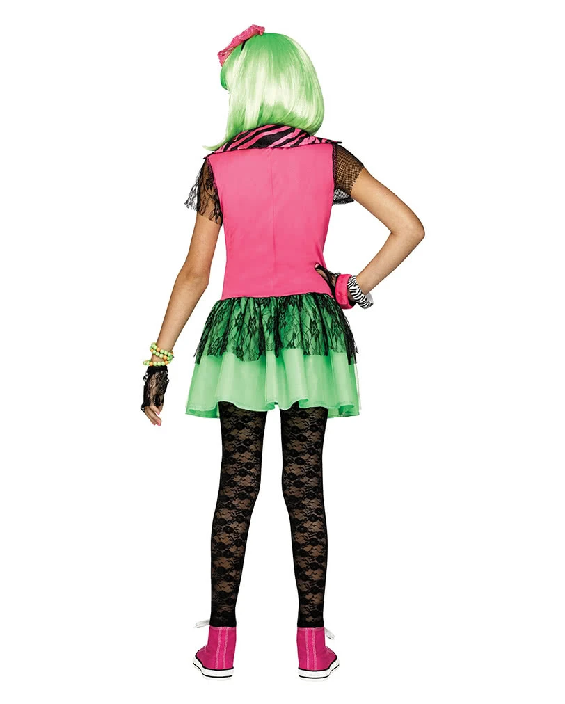 Das Rockkostüm für Kinder besteht aus mehreren Teilen. Das Kleid mit schrillem pinken Oberteil und giftgrünem Rock weist eine stilisierte, passend gestaltete Jeansjacke auf. Netzapplikationen an Schultern, Dekolleté und Rock schmücken das Rockstar Fastnachtkostüm zusätzlich. Die pinke Schleife wird mittels eines Haarreifs einfach ins Haar gesteckt. Zwei fingerlose Netzhandschuhe komplettieren das Bild eines Rockstars. Weitere geniale Kostüme für Kinder wie das Zombie Punk Rocker Girl Kinderkostüm und das Kleiner Biker Kinderkostüm haben wir ebenfalls auf Karneval-Universe.de!