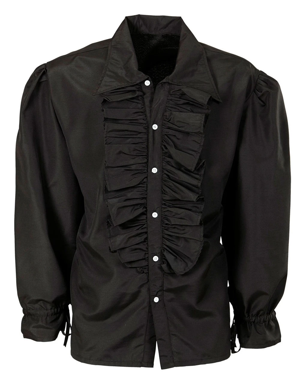 Bestell dir jetzt unser schwarzes Rüschenhemd und kleide dich damit vielfältig für Mottopartys und Kostümbälle. Das schwarze Hemd ist langärmlig und ist auf der Vorderseite zum knöpfen. An den Ärmeln sind die Bündchen durch Schnüre verstellbar.