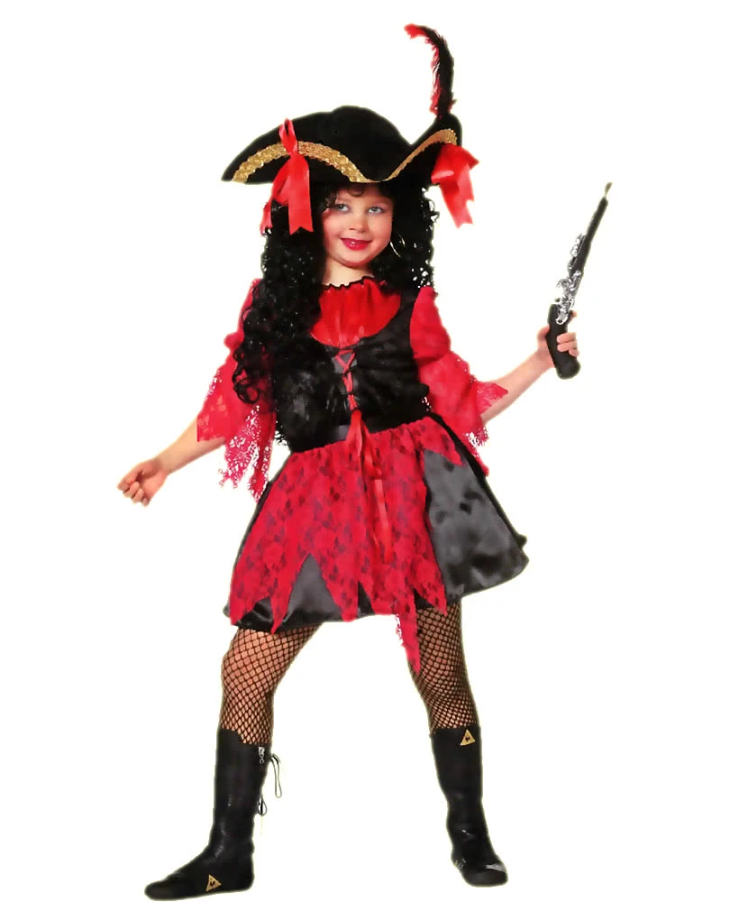 Beim Seeräuberin Mädchenkostüm geht es um ein Piratin Kostüm, das aus rot schwarzem Stoff gefertigt wurde. Das Piratin Oberteil verfügt über rote Ärmel aus Spitze und über einen Samt-Einsatz in schwarz, der eine rote Schnürung als Verzierung hat. Der schwarzen Rock des Seeräuberin Mädchenkostüms aus Satin hat eine roten fetzigen Einsatz aus zarter Spitze. Schließlich wird das Seeräuberin Mädchenkostüm mit einer schwarzen Schleife an der Taille zu Perfektion gebracht. Zu Deinem Piraten Mädchenkostüm passend, findest Du tollen Zubehör, wie z. B. einen Kinder Piratenhut oder eine Goldene Piraten Pistole mit Effekt, zum günstigen Preis bei Karneval-Universe.de