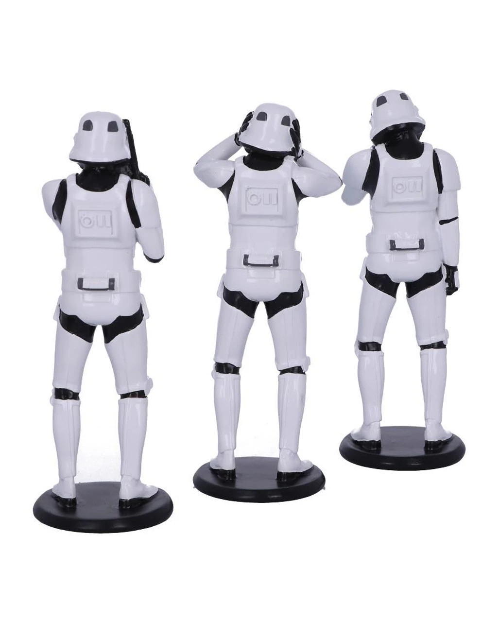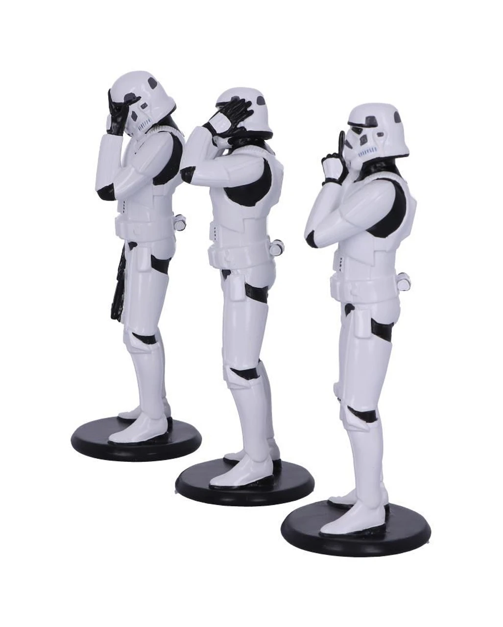 Die drei Stormtrooper-Figuren werden aus feinstem Polyresin gegossen und anschließend sorgfältig von Hand bemalt. Als Star Wars-Merchandise sind die Three Wise Stormtrooper eine grandiose Dekoration und ein fantastisches Geschenk für jeden Sci-Fi-Fan! Hier siehst du drei Troopers, die die alten Analyten von Konfuzius „Nichts sehen, nichts hören, nichts sagen“ darstellen. Der eine Stormtrooper fordert den Zuschauer auf, still zu sein, wenn er seinen Finger über seinen Mund unter dem Helm legt, während der andere seine Ohrlöcher abdeckt, um nichts Böses zu hören. Der letzte Trooper im Trio steht mit dem Kopf in der Hand, offensichtlich kann er nicht glauben, was er da sieht! Noch mehr Star Wars-Fanartikel wie das Qui-Gon Jinn Jedi Knight Lichtschwert und die Captain Phasma Maske für Erwachsene haben wir ebenfalls im Karneval-Universe.de!